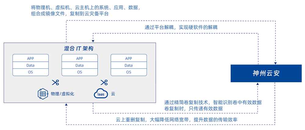 集备份、、、容灾功能为一体的云灾备平台产品,,将需要灾备保护的操作系统、、应用、、数据打包成一个云镜像文件,,灵活快速的复制到云灾备平台,,,为用户的混合 IT 环境提供统一的灾备保护。。