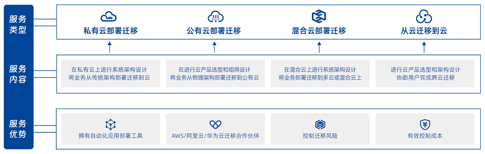 提供业务上云及云间迁移的端到端服务,,,评估业务系统现状,,,,规划设计迁移架构、、、、迁移技术和迁移方案,,,应用及数据上云迁移实施,,,云上系统部署,,,云上数据及业务验证,,迁移后运维保障及持续优化服务。。。