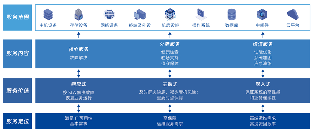 硬件维保(MA)服务:提供主机、、、存储、、网络、、终端及外设、、机房设施等硬件设备故障解决、、健康检查、、、、驻场支持、、、值守保障、、、、系统升级加固、、、、应急演练等服务。。。软件维保(MA)服务:提供操作系统、、、、数据库、、中间件、、、、存储软件等软件产品故障解决、、、、健康检查、、、、性能优化、、系统升级等服务。。